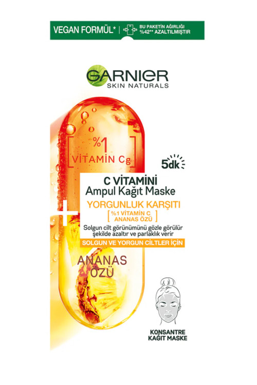 گارنیر ماسک صورت ورقهای با ترکیب ۱٪ ویتامین C و عصاره آناناس ارائه داده است که برای پوستهای خسته و کدر طراحی شده است. این ماسک در مدت ۵ دقیقه به پوست شما انرژی بخشیده و آن را درخشان میکند.